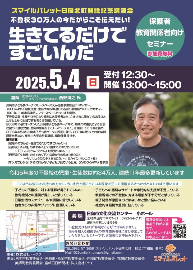 お知らせ 生きてるだけですごいんだ!西野博之氏セミナー開催 2025.02.28 不登校30万人に今だからこそ伝えたい! 「生きてるだけですごいんだ!」子どもに関わる全ての大人たちへ 2025/5/4 (日)13:00開催 受付12:30より