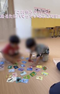 最近かるた遊びにハマっている子どもたち😆 「これしよ〜」とリクエストがあります! 手作りコマを作ると遊び方をすぐに覚えて何度も遊んでいました♪