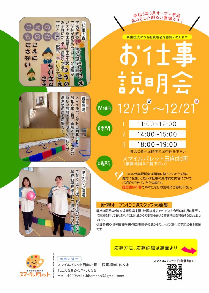 お問い合わせは スマイルパレット日向北町 採用担当 佐々木まで TEL:0982-57-3656
